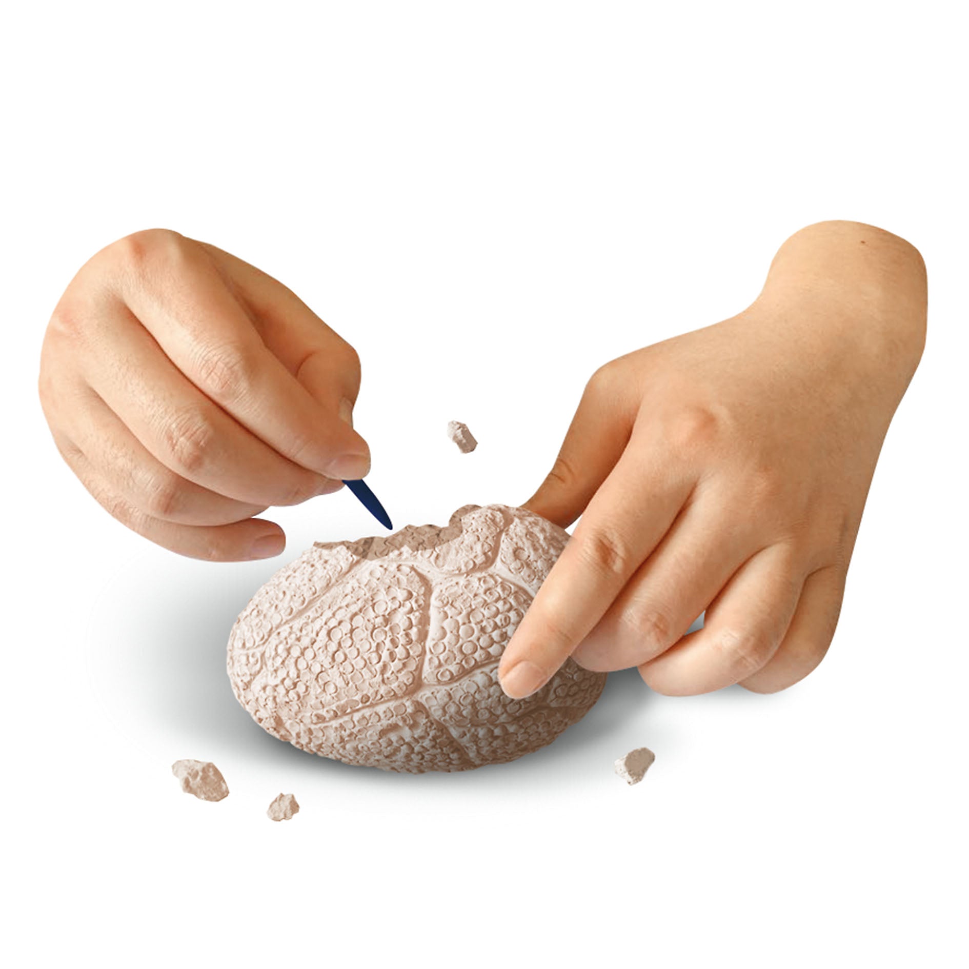 Für angehende Dino-Forscher: Mit dem Meißel des Ausgrabungs-Sets lässt sich aus dem Gips-Ei eine kleine Dino-Figur herausarbeiten.