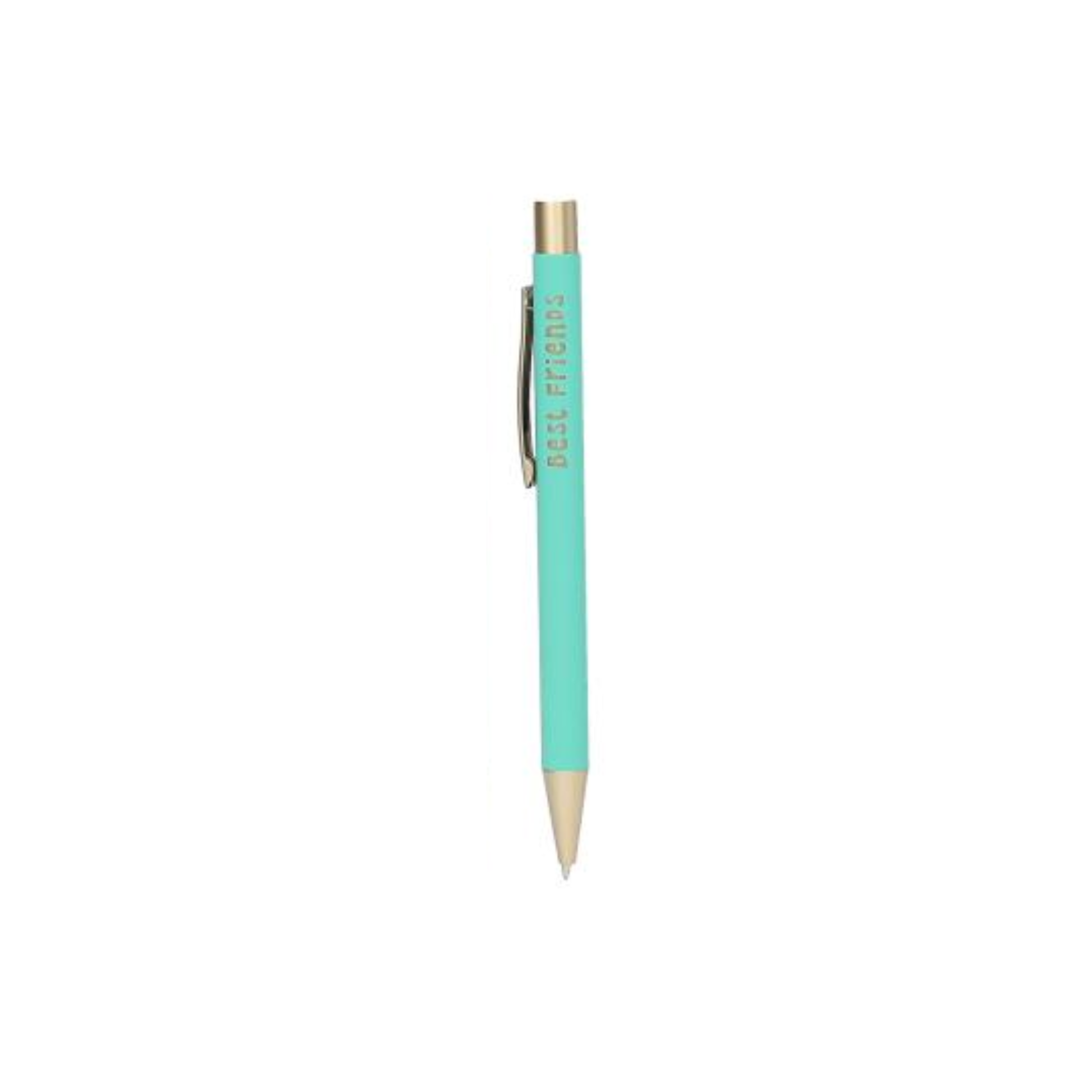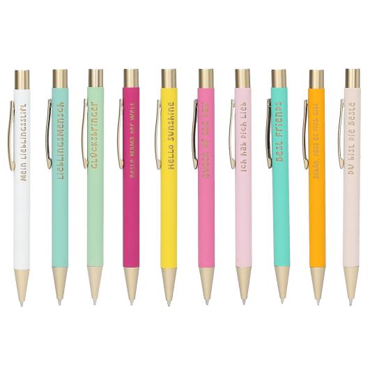 So macht Schreiben Spaß: Die farbenfrohen Kugelschreiber haben einen kurzen goldenen Textaufdruck und auch Clip und Knopf glänzen golden. Die Kugelschreiber schreiben mit schwarzer Tinte. Die Minen sind austauschbar. 10 tolle Motive/Texte.