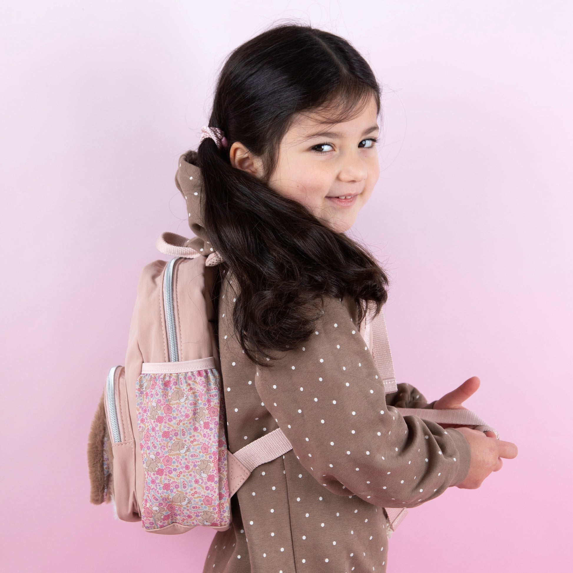 Wau, wow! Der superniedliche Rucksack hat auf der aufgesetzten Front-Tasche ein flauschiges braun-weißes Hundegesicht mit langen, weichen Schlappohren. Die Augen und die Nase sind eingestickt. Die zwei seitlichen Taschen und die zwei Reißverschluss-Anfasser ziert ein niedliches Blumenmuster. Der Rest des Rucksacks ist schlicht in zartem Rosé gehalten. Für angenehmes Tragen sorgen das gepolsterte Rückenteil, die gepolsterten Gurte sowie der Brustgurt. Im großen Innenfach gibt es ein separates Extra-Fach. Von Princess Mimi. Material: 100 Prozent Polyamid; Fell und Futter: 100 Prozent PES