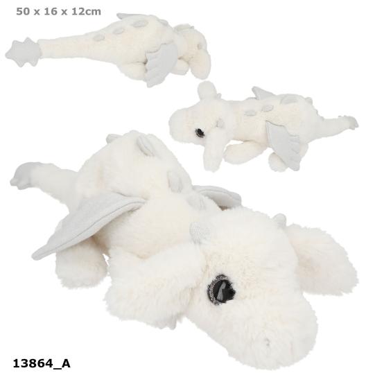 Fabelhafter Freund: Dieser weiße Plüsch-Drache von SNUKIS lädt ein zum Abtauchen in eine kuschelige Fantasiewelt. Silberne Glitzer-Zacken, weiße Krallen aus Filz und glitzernde Augen machen diesen Gefährten zu einem magischen Wesen. Auch das Schwanzende und die Hörner glitzern silber. Hauptmaterial: 100 Prozent Polyester