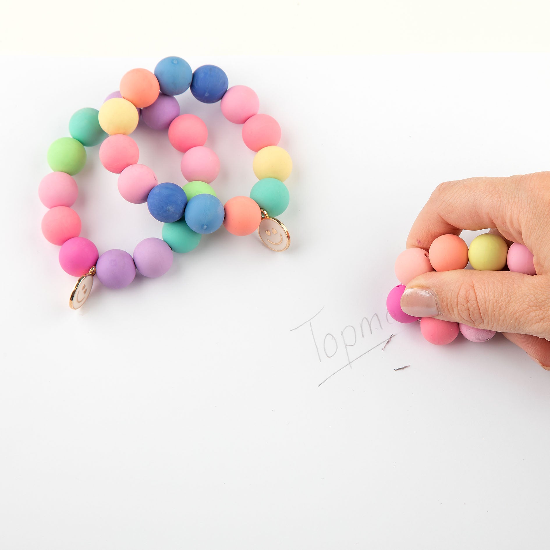 Cool und clever: Die Kugeln der bunten TOPModel-Armbänder sehen nicht nur total schön aus, sondern sind auch Radierer. 3 verschiedene Farb-Designs erhältlich, jeweils aufgefädelt auf einem elastischen, durchsichtigen Kunststoffband und mit einem goldfarbenen Anhänger mit Happy Face.