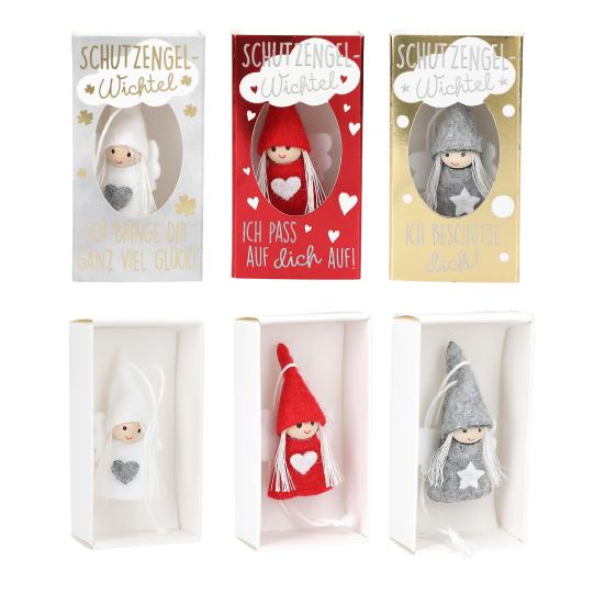 Passen immer auf: Die kleinen Wichtelanhänger sind eine süße Aufmerksamkeit für liebe Menschen, die einem am Herzen liegen. In Rot, Weiß und Grau, verpackt in einer niedlichen Schachtel zum Aufschieben mit Sichtfenster und einem süßen Spruch.